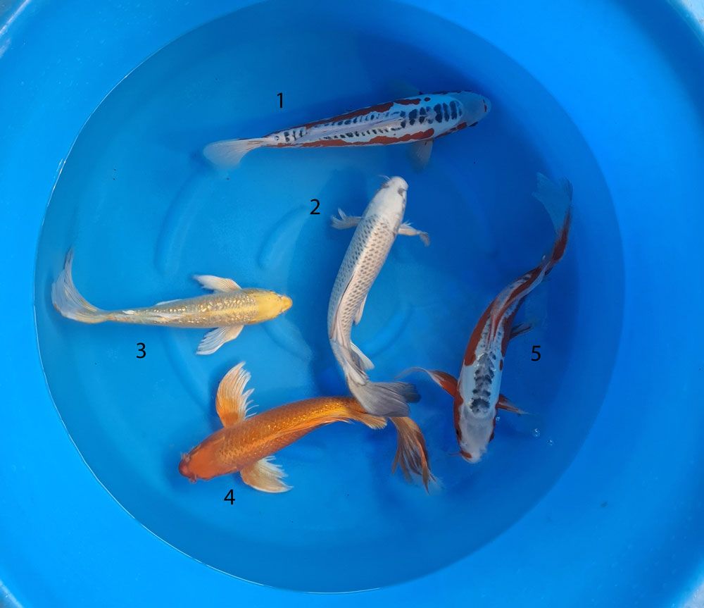 FOTO 51 - 1 SHUSUI - 2 LONG FIN GIN MATSUBA - 3 LONG FIN YAMABUKI GINRIN - 4 LONG FIN ORENJI OGNON; 5 LONG FIN SHUSUI - NISAI - 30/35 CM