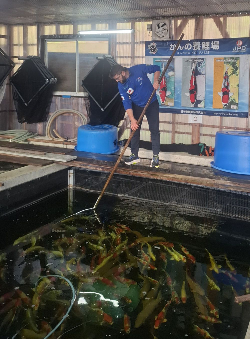 Mentre imbracciamo il guadino l'allevatore ci prepara i bowl pieni d'acqua.