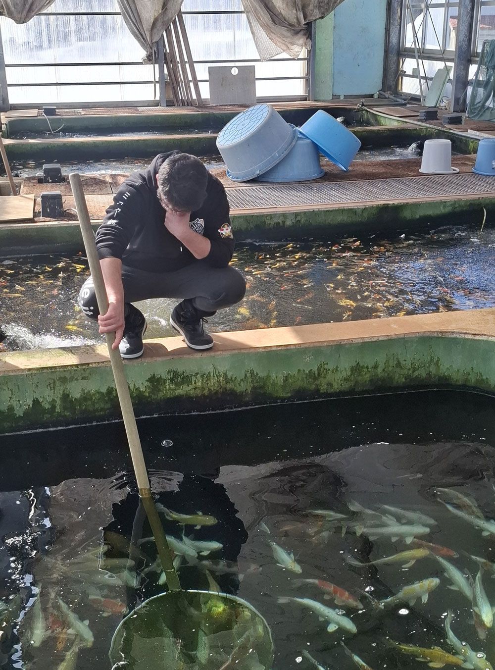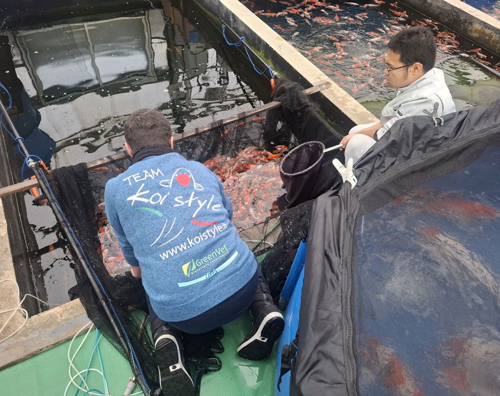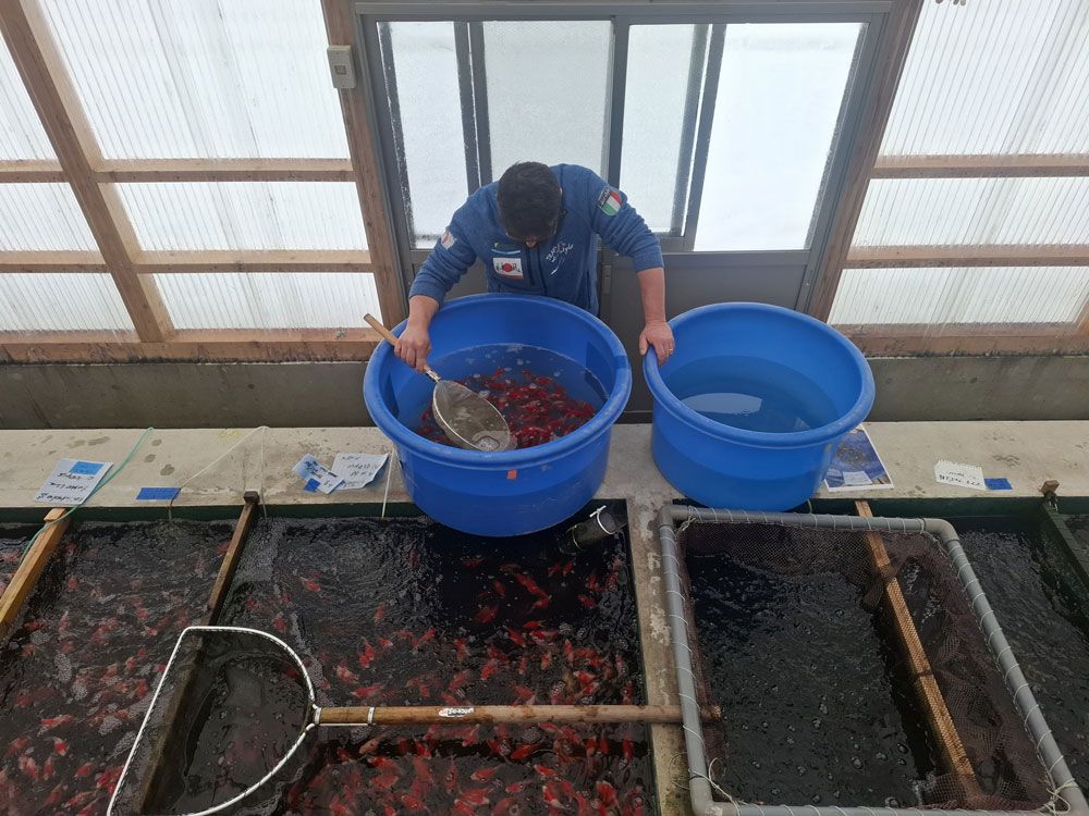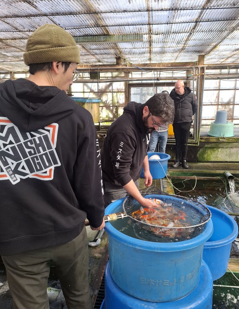 Il nostro obbiettivo è di trovare koi di genetica importante con un prezzo allettante. L' acqua è veramente gelida, le mani è come se fossero tagliate da lamedi ghiaccio, ma riusciamo comunque a selezionare un piccolo box niente male......