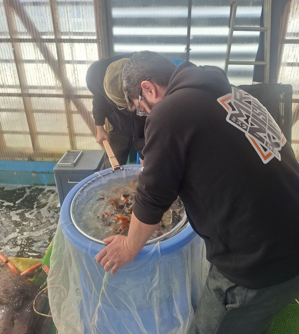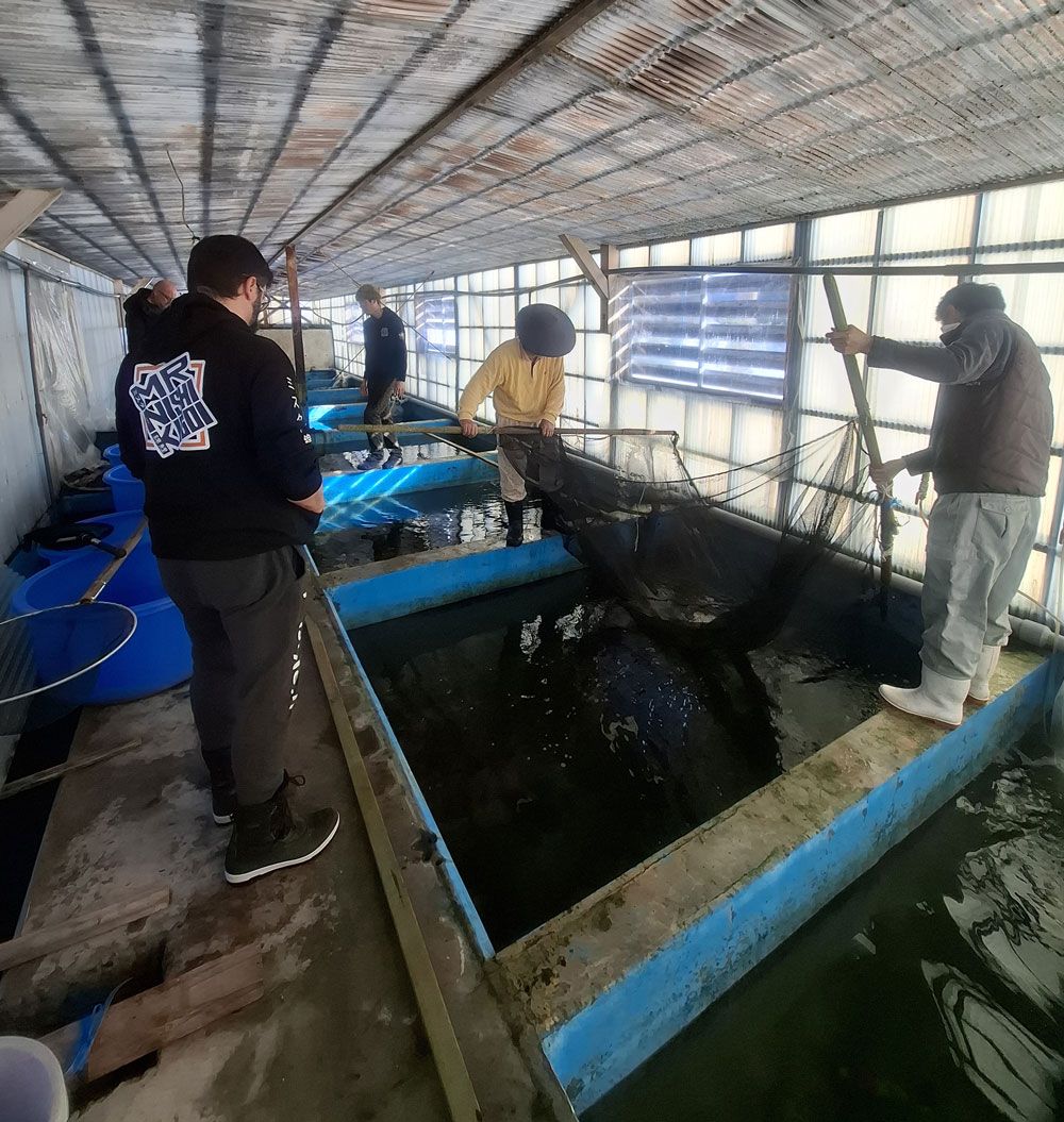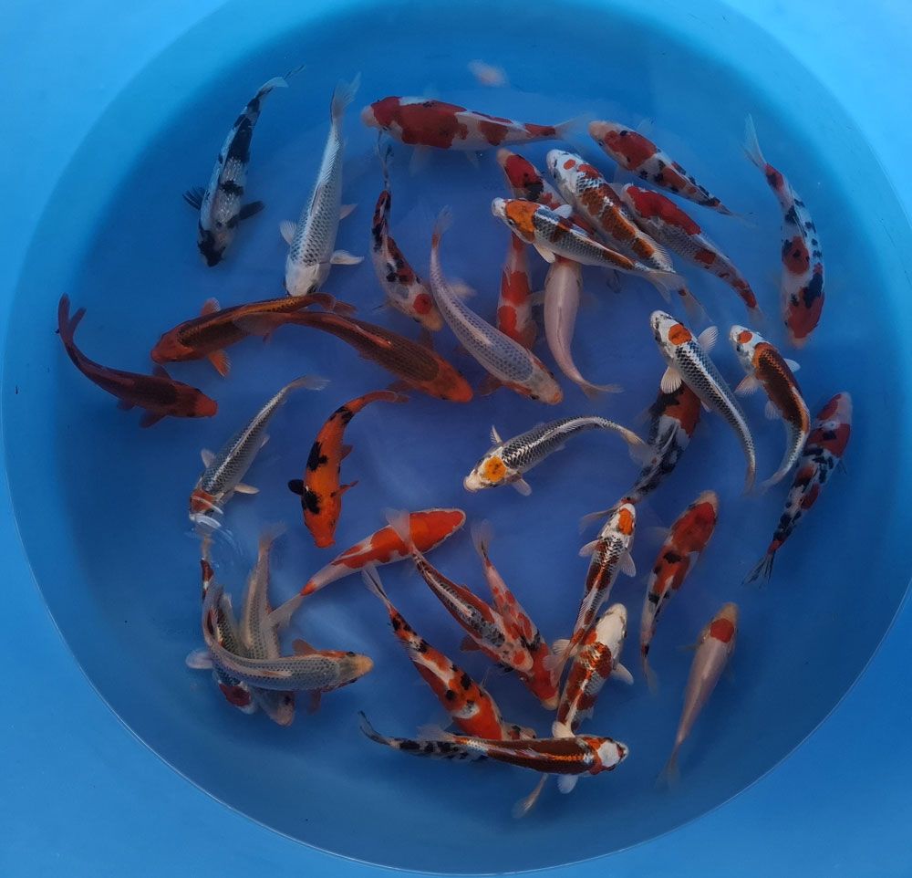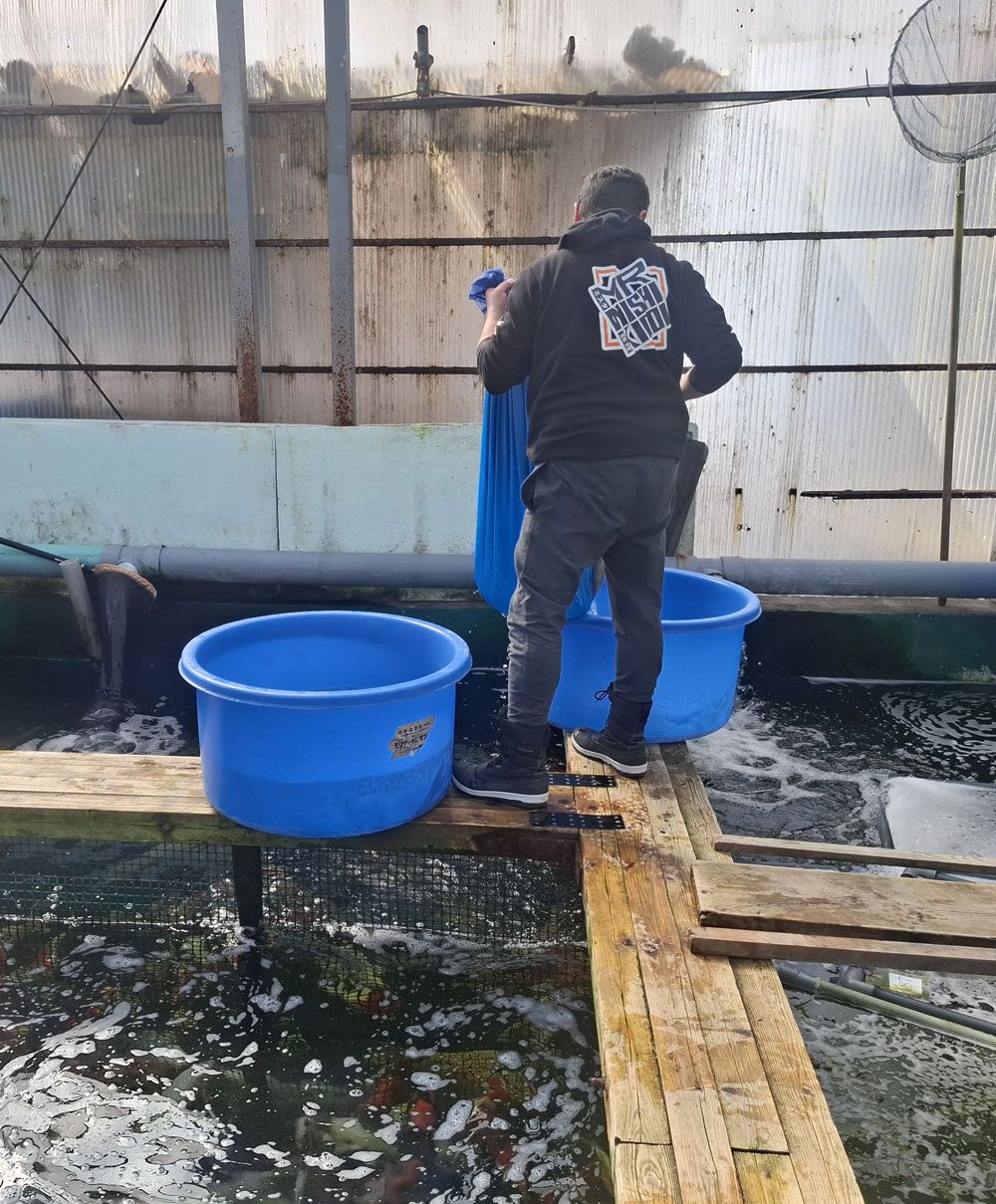 Il nostro obbiettivo è di trovare koi di genetica importante con un prezzo allettante. L' acqua è veramente gelida, le mani è come se fossero tagliate da lamedi ghiaccio, ma riusciamo comunque a selezionare un piccolo box niente male......