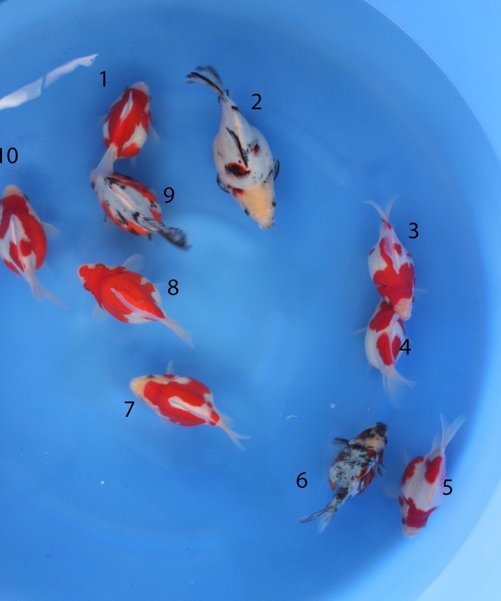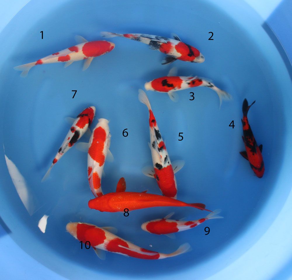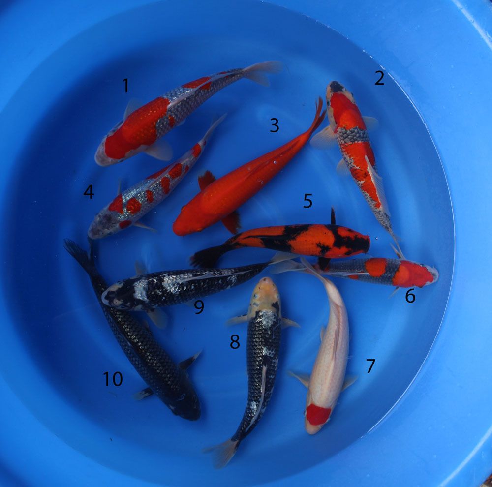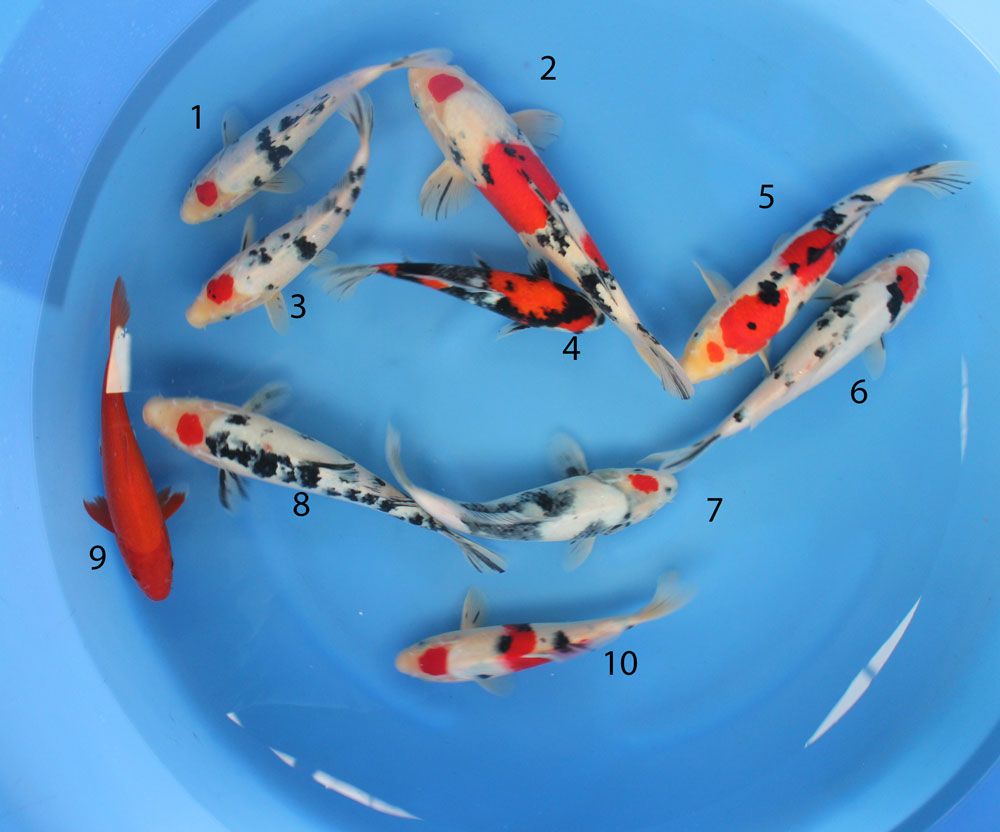 FOTO 7 - 1 GOSHIKI; 2 GOSHIKI; 3 BENIGOI; 4 GOSHIKI GINRIN; 5 HI UTSURI; 6 GOSHIKI; 7 TANCHO KOHAKU; 8 MATSUKAWABAKE; 9 MATSUKAWABAKE; 10 MATSUKAWABAKE (NISAI 30/34 CM)