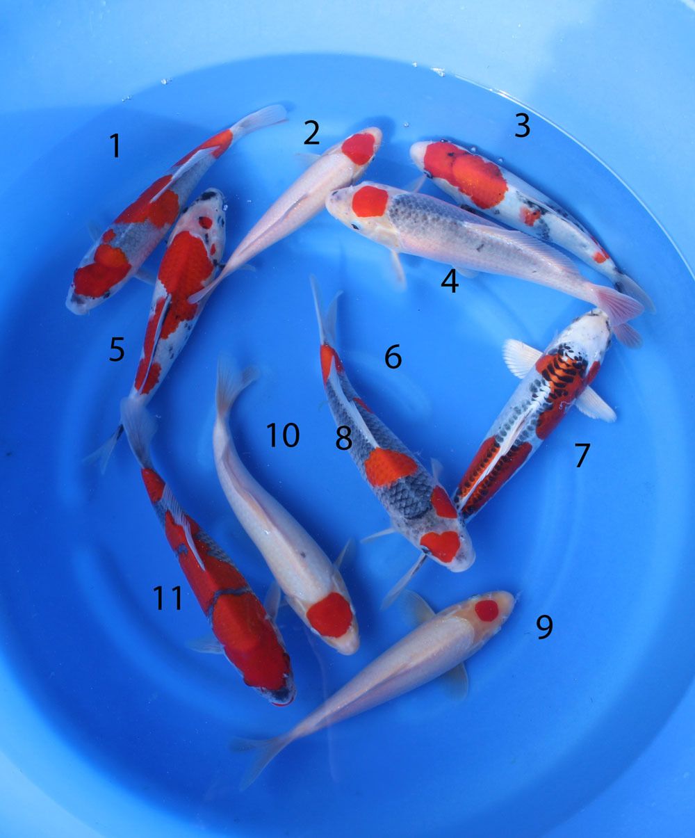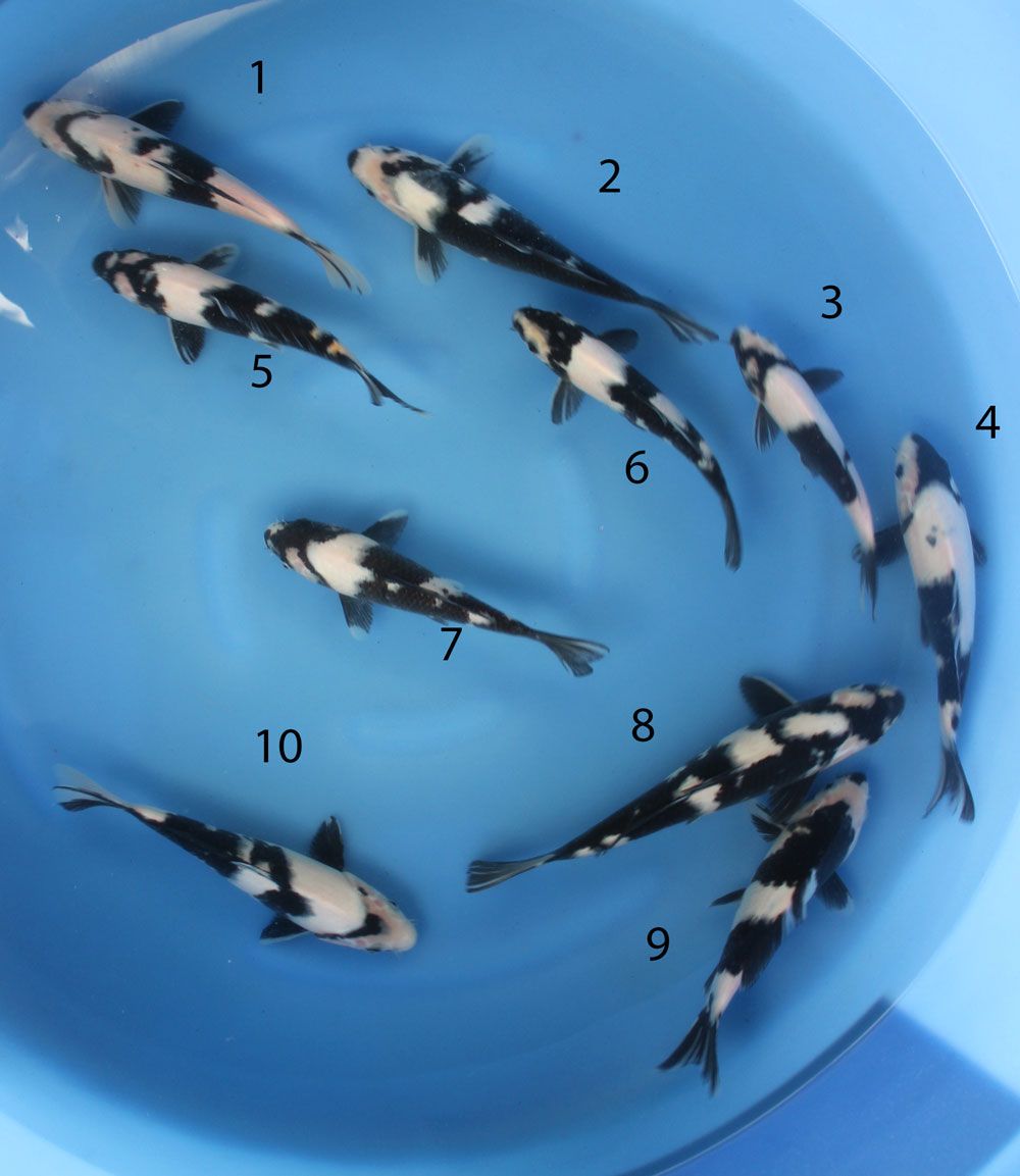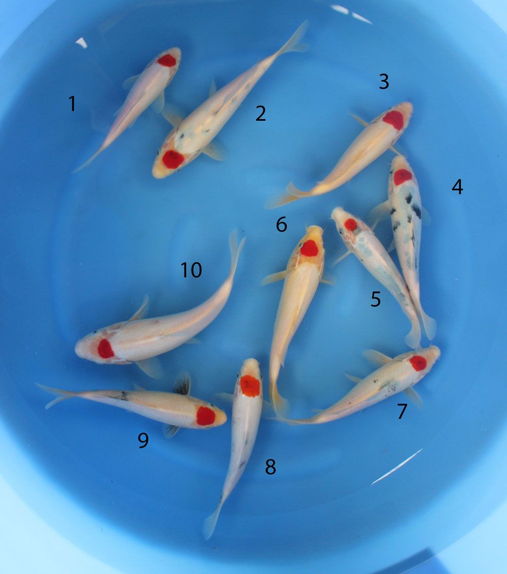 FOTO 7 - 1 GOSHIKI; 2 GOSHIKI; 3 BENIGOI; 4 GOSHIKI GINRIN; 5 HI UTSURI; 6 GOSHIKI; 7 TANCHO KOHAKU; 8 MATSUKAWABAKE; 9 MATSUKAWABAKE; 10 MATSUKAWABAKE (NISAI 30/34 CM)