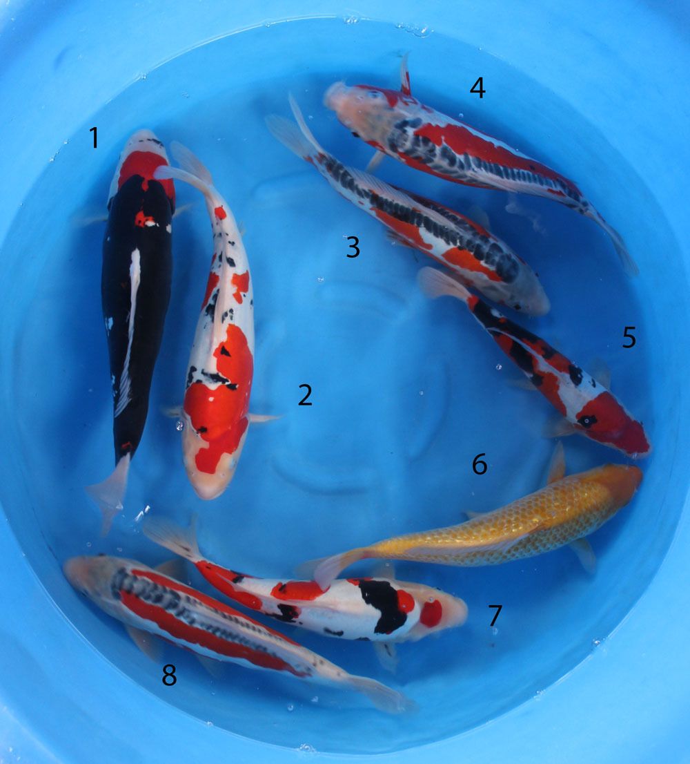 FOTO 11 - 1 BENI KUMONRYU; 2 SANKE DOITSU; 3 SHUSUI; 4 SHUSUI; 5 SANKE DOITSU; 6 KIGOI GINRIN; 7 MARUTEN KOMONRYU; 8 SHUSUI (NISAI 34/40 CM)